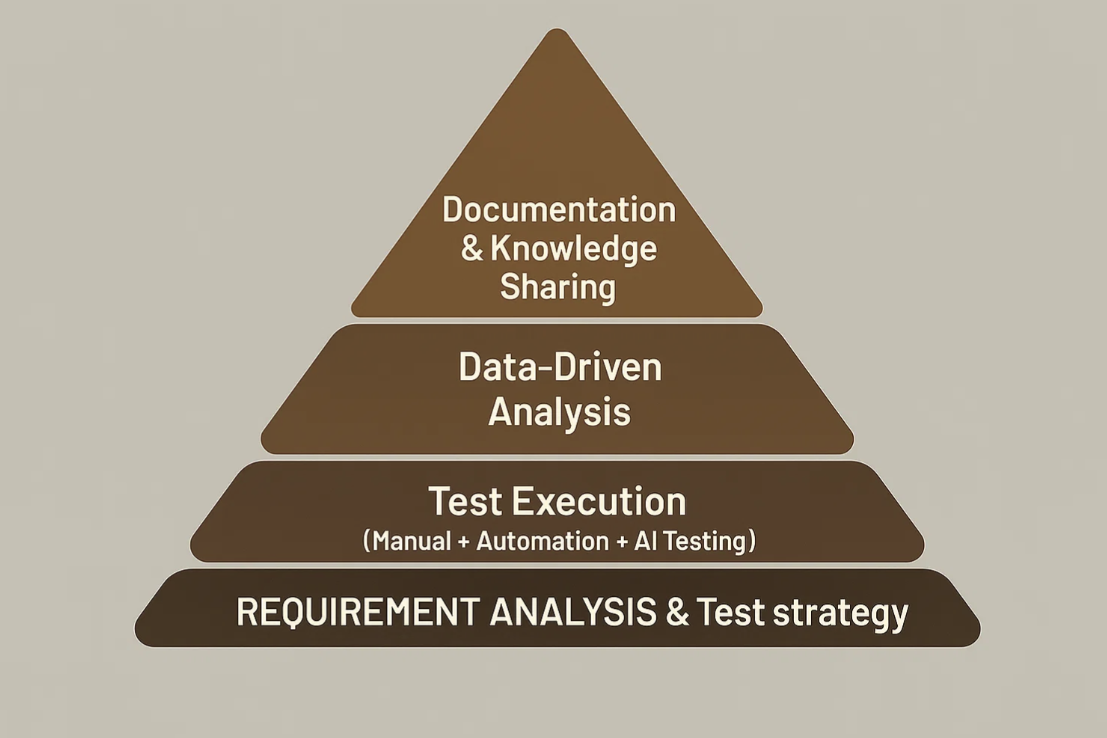This pyramid reflects how I approach QA/Testing: building quality from clear requirements, through execution and data-driven insights, to shared knowledge that strengthens every release.